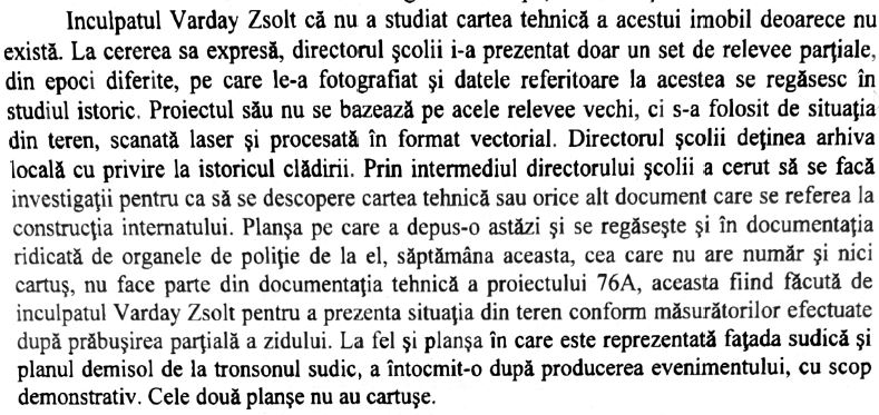 Várday Zsolt vádlott (azért? – hiányos mondat – szerk.) nem tanulmányozta ennek az épületnek a műszaki könyvét, mert az nem létezik. Kifejezett kérésére az iskola igazgatója csak egy sor részleges felmérést mutatott be neki különböző korszakokból, amelyeket lefényképezett, és az ezekre vonatkozó adatokat a történeti tanulmány tartalmazza. Az ő projektje nem ezeken a régi felméréseken alapult, hanem a helyszíni állapotot mérte fel, lézeres térszkenneléssel és vektor-formátumban feldolgozva. Az iskolaigazgató rendelkezett az épület történetét tartalmazó helyi archívummal. Az iskolaigazgató közvetítését kérte, hogy kutassák fel a műszaki könyvet vagy bármilyen más, az internátus építésére utaló dokumentumot. Az általa ma benyújtott rajz megtalálható a rendőrség által a héten tőle elvitt dokumentációban is, nincs sem száma, sem szövegmezője, nem a 76A projekt kiviteli dokumentációjának része, hanem Várday Zsolt vádlott készítette, hogy terephelyzetet szemléltesse a fal részleges beomlása után végzett mérések alapján. A déli homlokzatot és a déli szakasz alagsorszintjét ábrázoló rajzot is az eseményt követően készítette el, szemléltetés céljából. A két rajzon nincsenek szövegmezők.