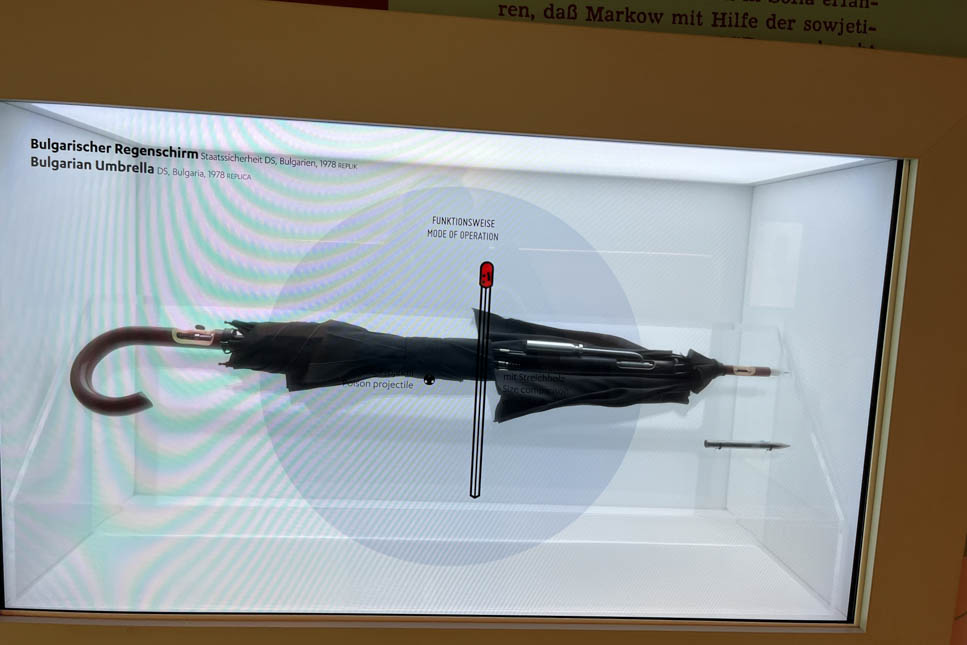 És ki nem maradhat a hírhedt bolgár ernyő, a Állambiztonság (DS) kreatív gyilkos eszköze, amely diszkréten képes ricint fecskendezni vékony tűn keresztül a célpont testébe, például 1978-ban a disszidens bolgár író, Georgi Markov meggyilkolására. Alább a replika fölött a működést bemutató videóból láthatók részletek.