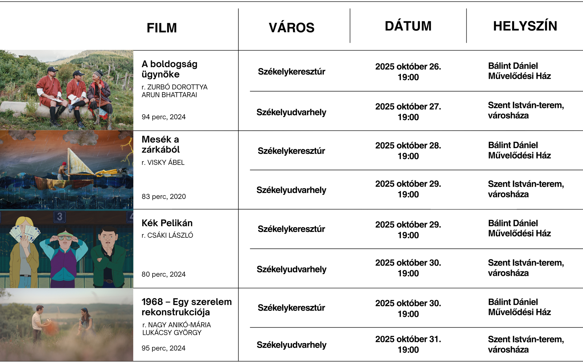 A DOKLAVINA vetítések Székelyudvarhelyen a Városháza Szent István-termében, míg Székelykeresztúron a Bálint Dániel Művelődési Házban lesznek. Minden vetítés este 19:00 órakor kezdődik.