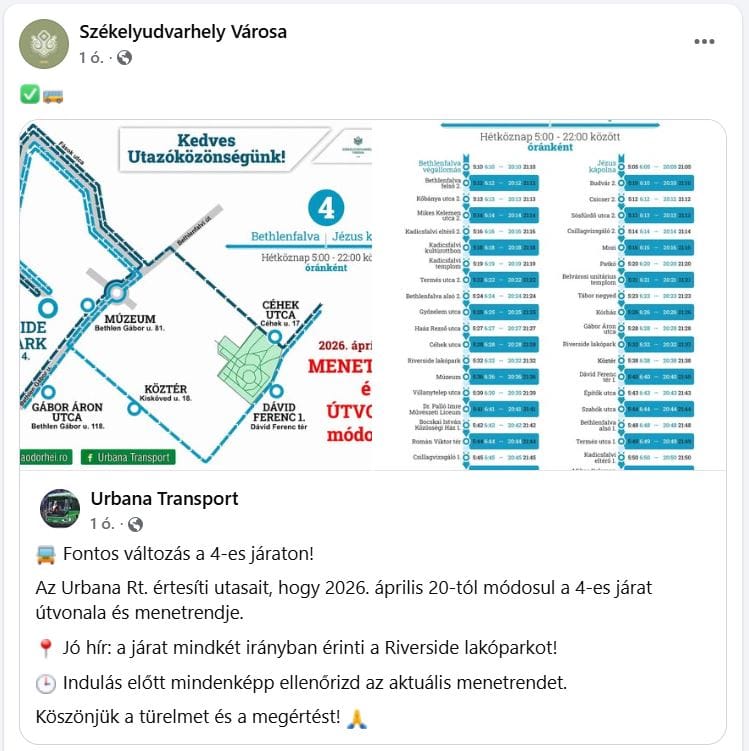 A városháza osztotta meg Facebook-oldalán a „jó hírt”, hogy ezentúl a 4-es busz bemegy a Riverside lakóparkba.