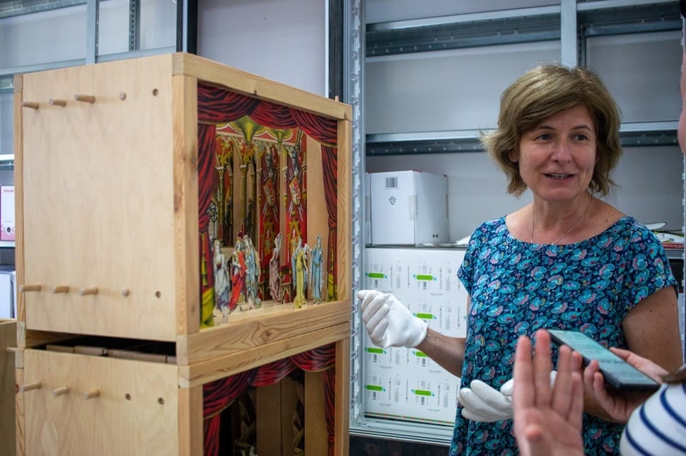 Beszélgettünk még az aktuális kiállításról, megtudtuk több dologra is nagyon oda kell figyelni a kis színházak összeállításánál. Először is arra, hogy ne keveredjenek össze az elemek, illetve hogy ne sérüljenek, ennek érdekében savmentes papírban szállítják őket és kesztyűben érnek csak hozzájuk. A fénnyel is vigyázni kell, hogy ne károsodjanak.
