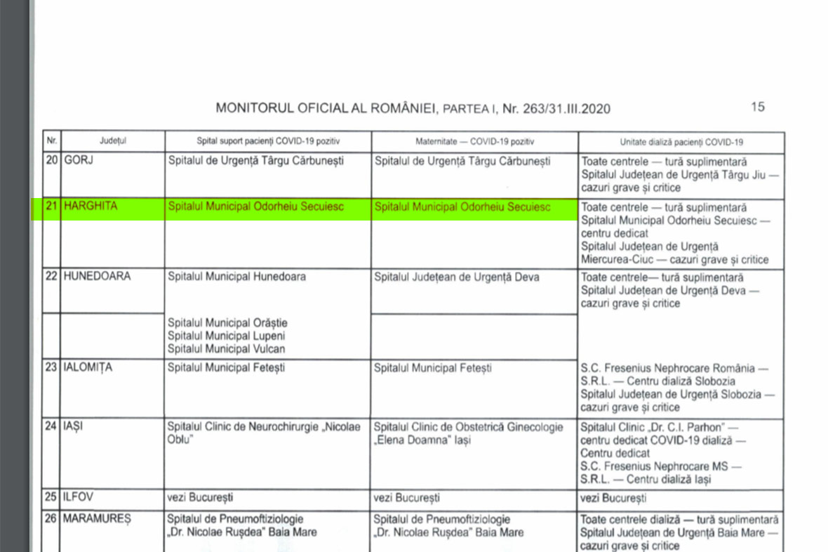 Hargita megye esetébena Spital suport pacienți COVID-19 pozitiv oszlopban a székelyudvarhelyi városi kórház szerepel a táblázatban, a COVID-19 szülészet oszlopban szintén a székelyudvarhelyi kórház jelenik meg. Ez azt jelenti, hogy a koronavírusfertőzésben szenvedő kismamák itt fognak szülni, Udvarhelyen. A harmadik oszlop a dialízisre szoruló betegekre vonatkozik, őket a székelyudvarhelyiben, és a hivatalos működési programon túl az összes megyei központban kezelhetik. A csíkszeredai megyei sürgősségi kórház neve egyetlen helyen tűnik fel a táblázatban: a dialízises betegekről szóló oszlopban. Azt írja mellette, hogy súlyos, kritikus esetek.