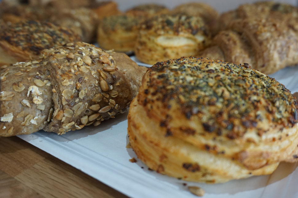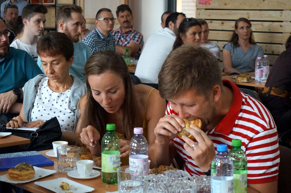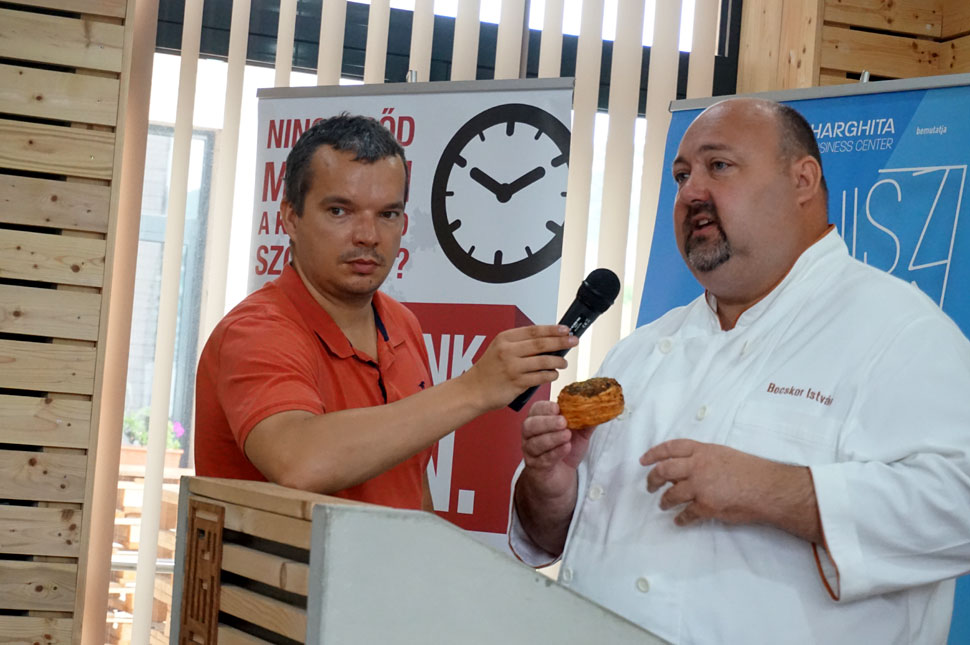 Kétféle péksüteményt hozott: egy pogácsát, 2017 péksüteményét egy és croissant-t. „Egy hideg tésztavezetéssel indítunk, nagyon nehéz így a vajjal dolgozni, de nagyon szép eredmények lesznek. Nagyon alacsony hőmérsékleten próbálunk érlelni egy kis baktériumot, azáltal egy teljesen más íz- és formavilágot hozunk létre” – vezetett be a készítési folyamatba, majd megkérte a jelenlévőket, mielőtt megkóstolják, törjék meg a péksüteményt, szagoljanak bele, és tegyék ezt mindig.