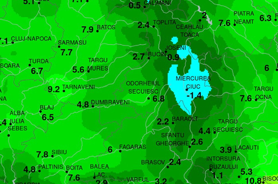 –1,4 Celsius-fokot mértek Csíkszeredában és környékén vasárnapról hétfőre virradó éjszaka, szerencsére rövid ideig volt fagypont alatt – közölte a Szentegyházi meteo állomás Facebook-oldal.