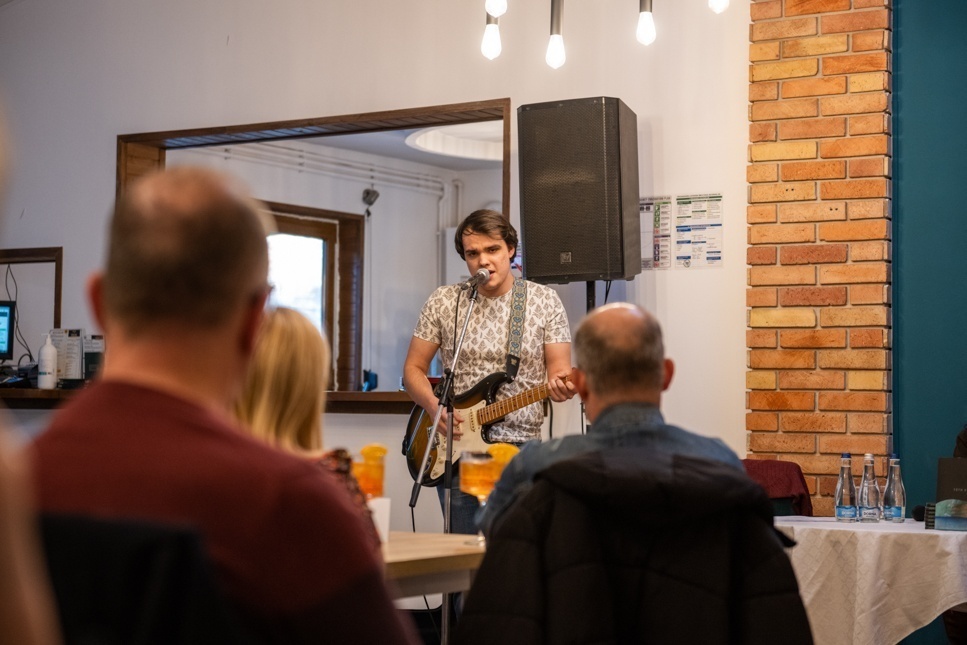 Tóth Krisztina költő, író és fia, Marci, azaz Szántó Marcell, bölcsész-zenész találkoztatták a verset a zenével, magukat a közönséggel hétfőn a Retro Gold étteremben. Már az első percekben feltűnik, hogy – akárcsak Tóth Krisztina alkotásaiban – itt minden alaposan meg van tervezve. A Bálnadal című, 2017-2020 között írt verseket tartalmazó kötet zenés-felolvasós bemutatója is aprólékosan kimunkált, minden a helyén, semmi giccs, semmi túlzás.