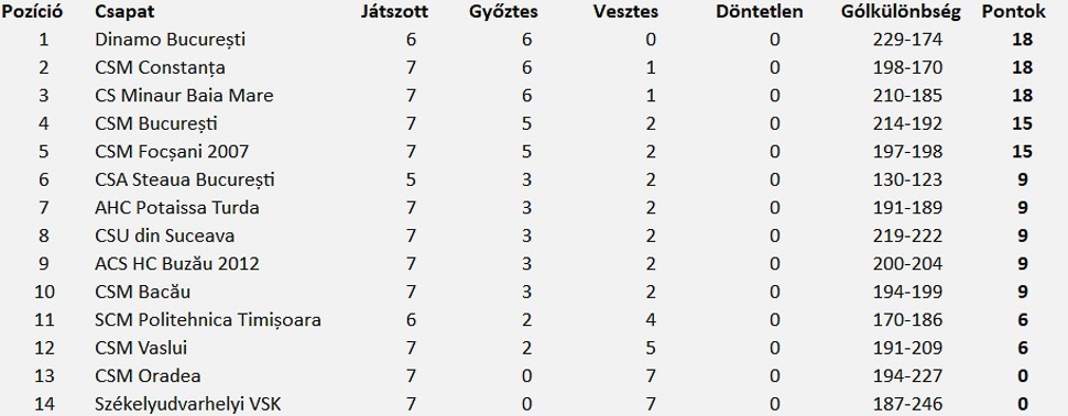 Csibi révén szerezték meg a vezetést az udvarhelyiek, majd Couveiro és Dedu jó pillanatainak köszönhetően elléptek 5–2-re. Kapaszkodtak ugyan a vendégek, Ferencziék percekkel később ismét visszaszerezték néhány gólos előnyüket, és tartották is ezt egészen az első félidő hajrájáig. A huszadik perc környékén Fekete és Hadnagy kétperces kiállításai, és a több elhibázott lövés néhány perces udvarhelyi gólcsendet hozott, ami azt eredményezte, hogy először egyenlített, majd átvette a vezetést Focșani, amely végül egygólos előnnyel várhatta a következő játékrészt.