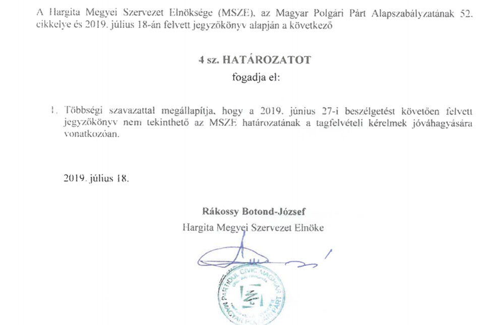 Az ugyancsak július 18-án keltezett 4. számú MSZE-határozatban azonban a megyei elnökség többségi szavazattal eldöntötte, hogy a június 27-ei jegyzőkönyv még nem tekinthető érvényes tagságfelvételnek, csupán egy előzetes beleegyezésnek.