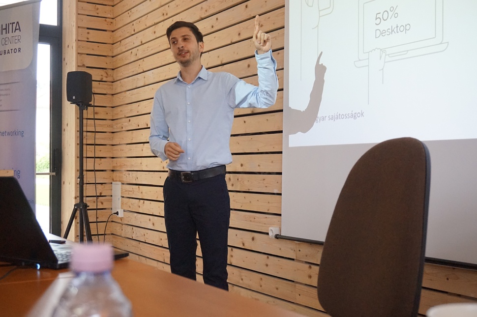 Kállai Emánuel a Sales Origo ügyvezetője, online marketing szakértő tartott előadást Hogyan pofozza a fogyasztó a marketingtevékenységet? címmel. Emánuel közgazdaságtant tanult, de még azelőtt elkezdte foglalkoztatni, miért osztanak meg sokan ingyenesen olyan anyagokat a neten, amelyekért egy tréningen 1000 euró körüli összegeket fizetnek ki, és miért kell suliba járni, ha 10-15 perc alatt felszedhetjük ugyanazt a tudást, amit egy tanár egy órán keresztül próbál átadni saját módszerével.