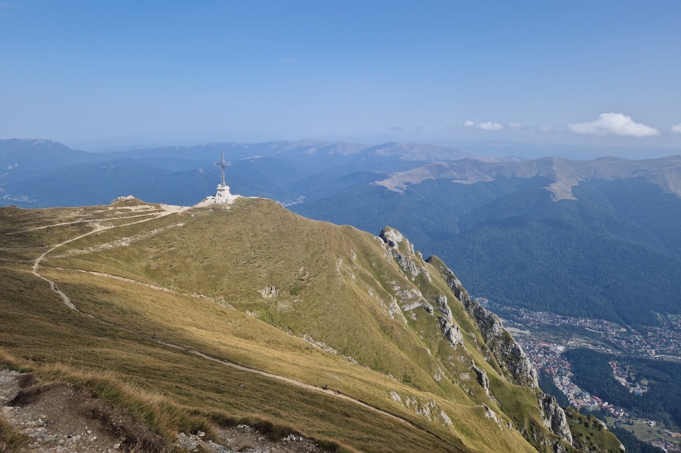 Az említett menedékháztól egy 30-40 perces kitérővel a Caraiman-sziklafal peremén (kék kör) az óriáskereszthez is eljuthatunk, amelyet Mária királyné az I. világháborús román hősök emlékére állíttatott.