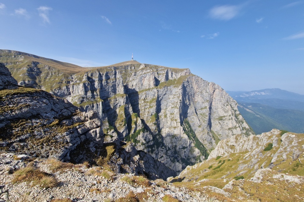 A Caraiman-csúcsról panorámakilátás nyílik a Prahova völgyére és a Coștila szédítő sziklafalára, melynek tetején a Bucegi másik szimbólumát, a nagy piros-fehér rádiótornyot találjuk (lent). Ha a kereszttől mennénk tovább a Babeléhez, a vörös keresztet kövessük egy órácskán át.