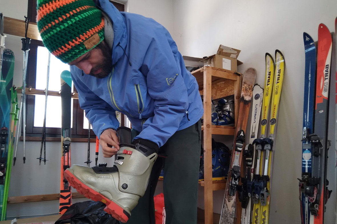 Laza menetre készülünk, örülünk a jó időnek, nem sietjük el a dolgot. Előd mindenkinek segít, ad néhány jó tippet, alapinstrukciót. Nincs ebben semmi boszorkányság, csak tenni kell egyik lábat a másik után, és mész is felfelé. A csel az úgynevezett fóka, amit ráhúzol a léc talpára, attól nem csúszik vissza a léc hágóra menet. Na meg a kötés, amiből a bakancs sarka kijár, mint a futólécnél, és állítható a magassága, úgy hajtod magad előre. Ennyi az egész.