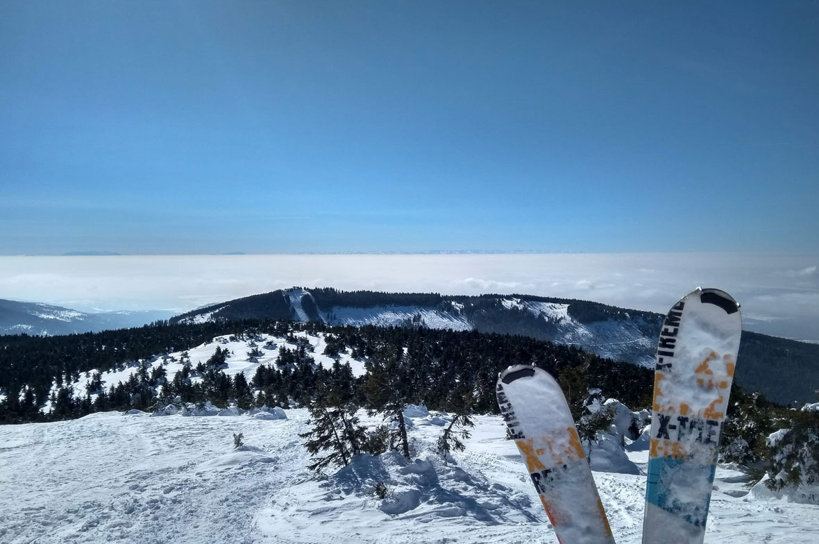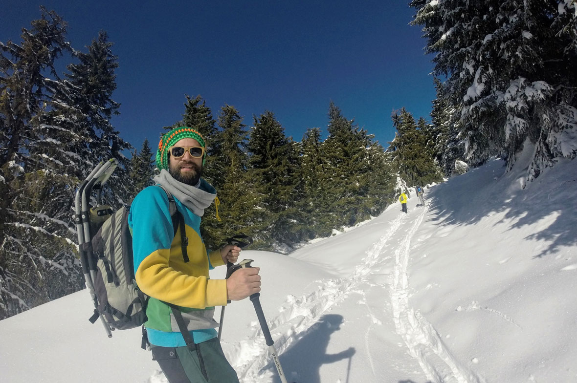 Éppen egy éve volt, amikor sokkal bőkezűbb volt a hóisten, és Biró Előd barátom sítúrázni vitt el, hogy megmutassa egy olyan oldalát a hegynek, amit még nem ismertem. Télen, napsütésben, a felhők felett. Mivel méteres hó is lehet odafent, a hegyet csak segédeszközökkel lehet igazán bejárni, túraléccel vagy hótalpon. Van is egy raktárnyi felszerelés hozzá Zetelakán, a Hargita Outdoor főhadiszállásán. Számomra ez maga a paradicsom, Előd meg egy mázlista. A hegy tövében lakik családjával, egy szép nagy házban, aminek távirányítós székelykapuja is van. Innen tényleg bármikor mehet a hegyre.