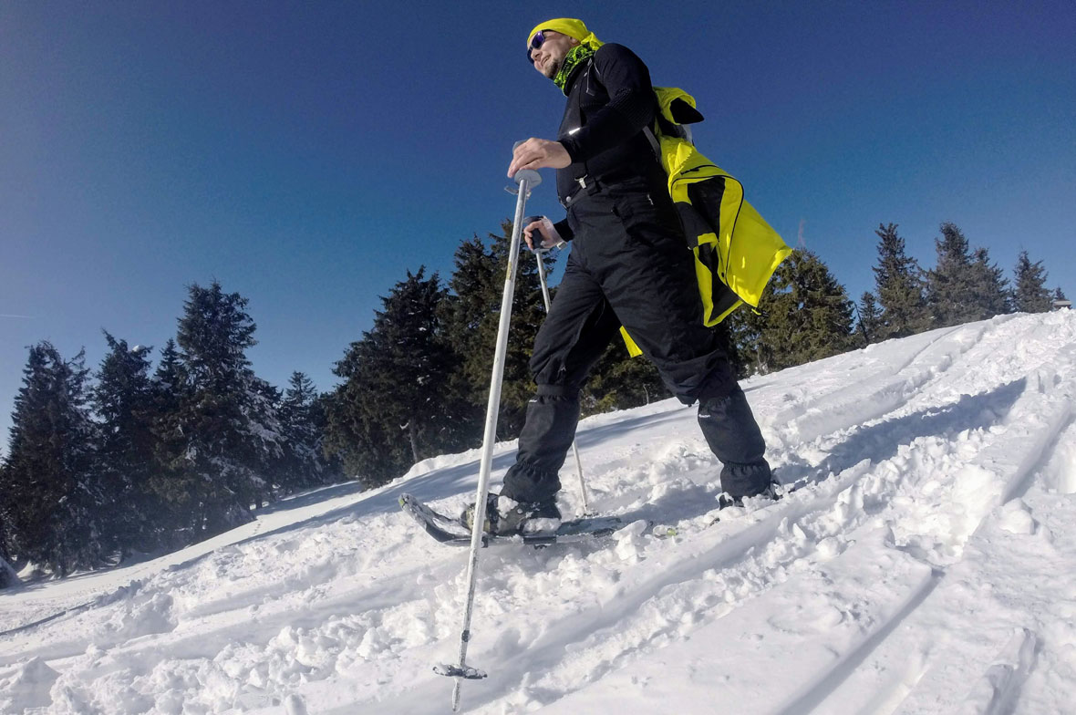 Picit félénken indulunk neki a meredek lejtőnek, van, aki inkább lecsatolja a léceket, és a hótalpasokkal tart. Túravezetőnk gyakorlott sízőként előre megy, de időnként bevár minket. Olyan egyszerűnek tűnik, ahogy suhan a fák között, de jaj annak, aki utánozni meri – emlékeztet a sajgó hátsó néhány napig.