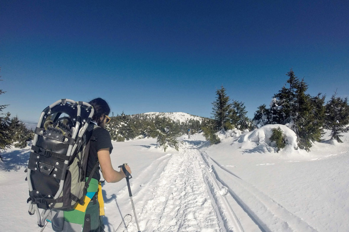 Amint készen áll mindenki, neki is lódulunk a nagy havasnak a menedékház előtti parkolóból. Tulajdonképpen egy volt sípálya mentén haladunk a csúcs felé, az Árkoson – az öreg sízők talán még emlékeznek is rá. Nincs kitaposott ösvény, csupán néhány nyom utal arra, hogy más is járt még itt előttünk, de csakis sítalpakon. Helyenként lyukak tátonganak, abból látjuk, hogy milyen mély is a hó. Húsz méternél is szűkebb a tarvágás, ami az erdőt kettévágja, ezen haladunk libasorban előre. Néhányan máris lemaradnak.