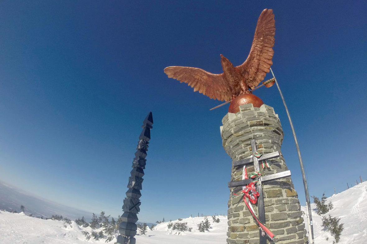 Ahogy kiérünk, bevárjuk egymást, megszusszanunk a turul lábánál, mögötte mintha egy temető bújna elő a hóból. Giccsparádé vagy emlékhely? Nem tudjuk eldönteni, hova soroljuk a kopjafákkal, zászlókkal, szobrocskákkal, kövekkel agyonpakolt hegytetőt. Évek óta nem jártam itt, valósággal sokkol ez a díszrengeteg, ami fogad minket.