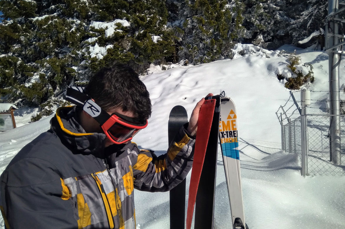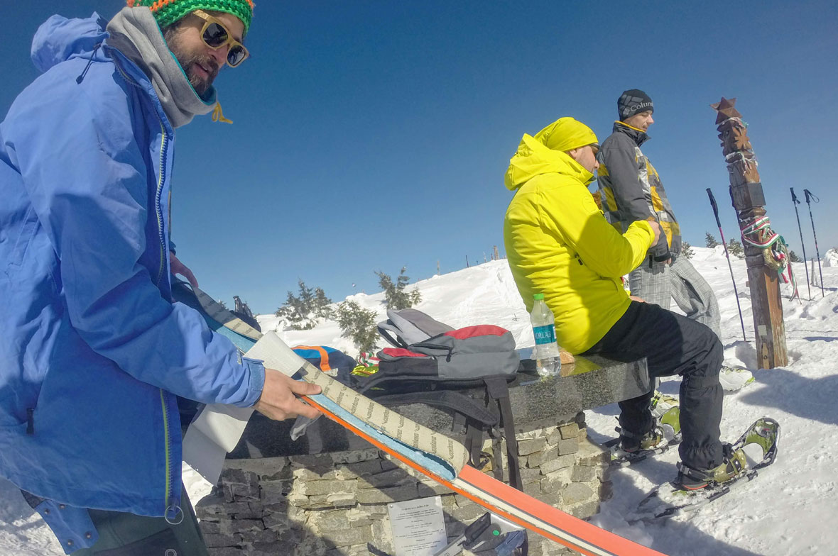 Laza menetre készülünk, örülünk a jó időnek, nem sietjük el a dolgot. Előd mindenkinek segít, ad néhány jó tippet, alapinstrukciót. Nincs ebben semmi boszorkányság, csak tenni kell egyik lábat a másik után, és mész is felfelé. A csel az úgynevezett fóka, amit ráhúzol a léc talpára, attól nem csúszik vissza a léc hágóra menet. Na meg a kötés, amiből a bakancs sarka kijár, mint a futólécnél, és állítható a magassága, úgy hajtod magad előre. Ennyi az egész.
