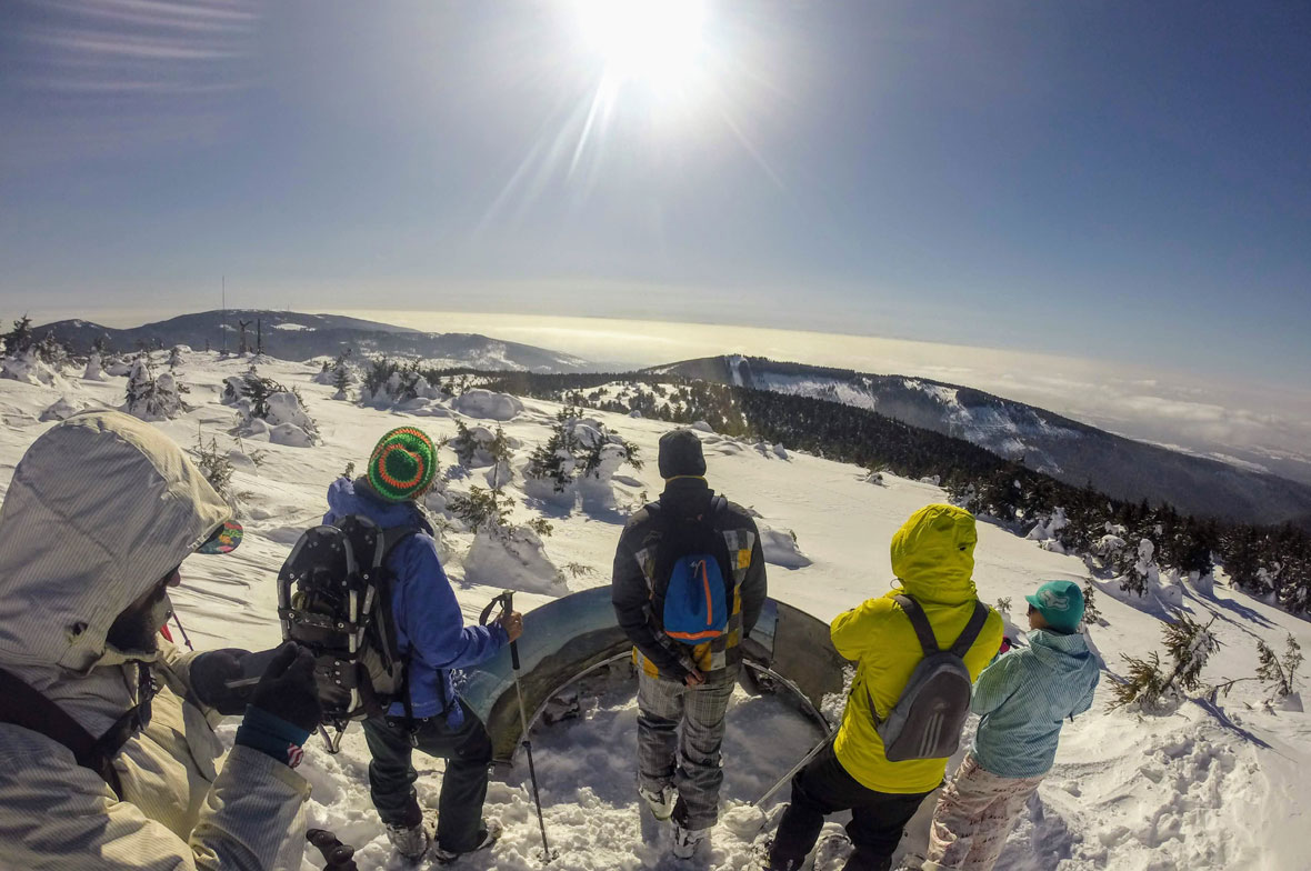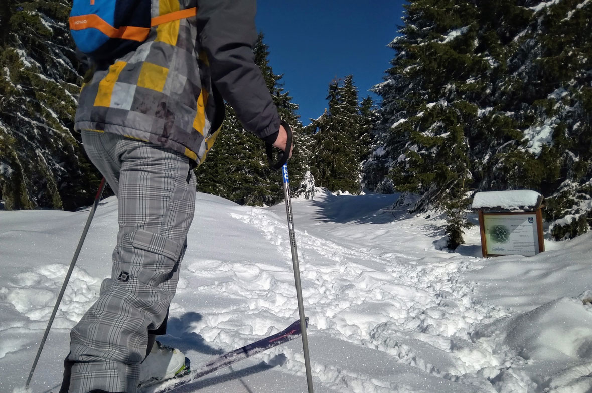 Amint készen áll mindenki, neki is lódulunk a nagy havasnak a menedékház előtti parkolóból. Tulajdonképpen egy volt sípálya mentén haladunk a csúcs felé, az Árkoson – az öreg sízők talán még emlékeznek is rá. Nincs kitaposott ösvény, csupán néhány nyom utal arra, hogy más is járt még itt előttünk, de csakis sítalpakon. Helyenként lyukak tátonganak, abból látjuk, hogy milyen mély is a hó. Húsz méternél is szűkebb a tarvágás, ami az erdőt kettévágja, ezen haladunk libasorban előre. Néhányan máris lemaradnak.