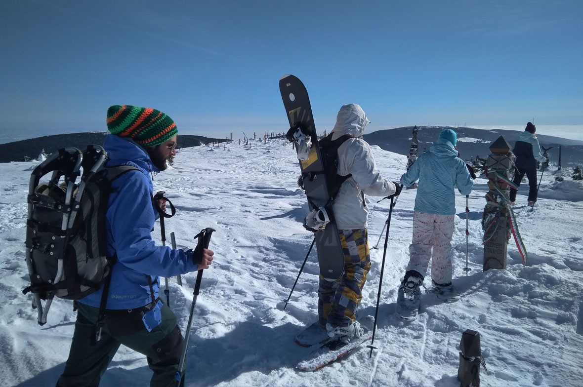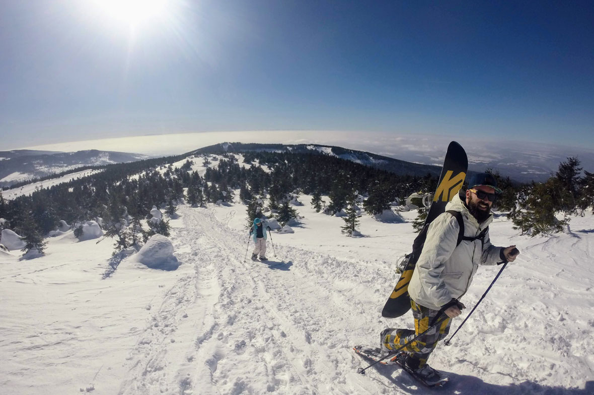 Éppen egy éve volt, amikor sokkal bőkezűbb volt a hóisten, és Biró Előd barátom sítúrázni vitt el, hogy megmutassa egy olyan oldalát a hegynek, amit még nem ismertem. Télen, napsütésben, a felhők felett. Mivel méteres hó is lehet odafent, a hegyet csak segédeszközökkel lehet igazán bejárni, túraléccel vagy hótalpon. Van is egy raktárnyi felszerelés hozzá Zetelakán, a Hargita Outdoor főhadiszállásán. Számomra ez maga a paradicsom, Előd meg egy mázlista. A hegy tövében lakik családjával, egy szép nagy házban, aminek távirányítós székelykapuja is van. Innen tényleg bármikor mehet a hegyre.