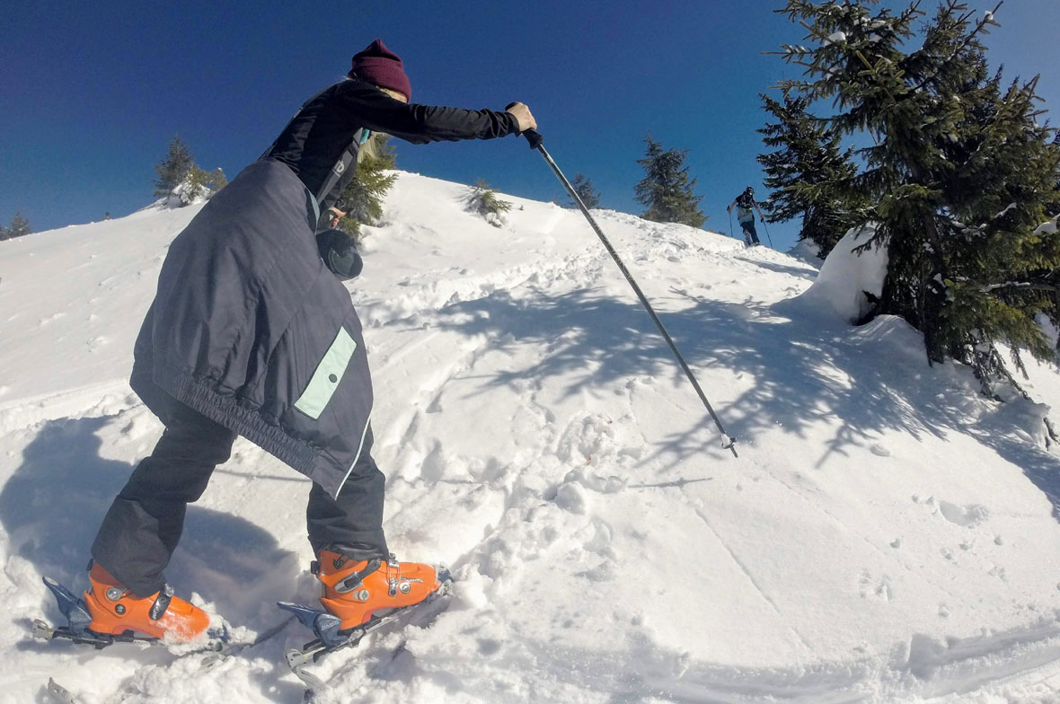 Picit félénken indulunk neki a meredek lejtőnek, van, aki inkább lecsatolja a léceket, és a hótalpasokkal tart. Túravezetőnk gyakorlott sízőként előre megy, de időnként bevár minket. Olyan egyszerűnek tűnik, ahogy suhan a fák között, de jaj annak, aki utánozni meri – emlékeztet a sajgó hátsó néhány napig.