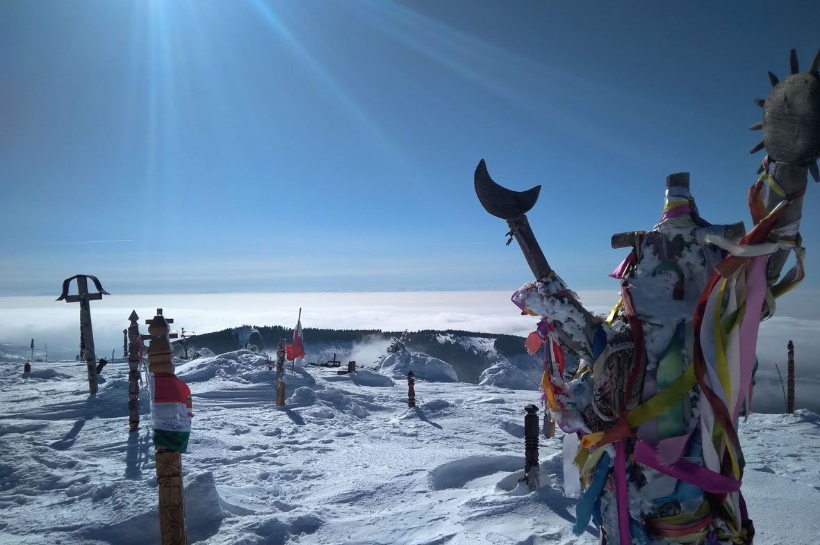 Ahogy kiérünk, bevárjuk egymást, megszusszanunk a turul lábánál, mögötte mintha egy temető bújna elő a hóból. Giccsparádé vagy emlékhely? Nem tudjuk eldönteni, hova soroljuk a kopjafákkal, zászlókkal, szobrocskákkal, kövekkel agyonpakolt hegytetőt. Évek óta nem jártam itt, valósággal sokkol ez a díszrengeteg, ami fogad minket.