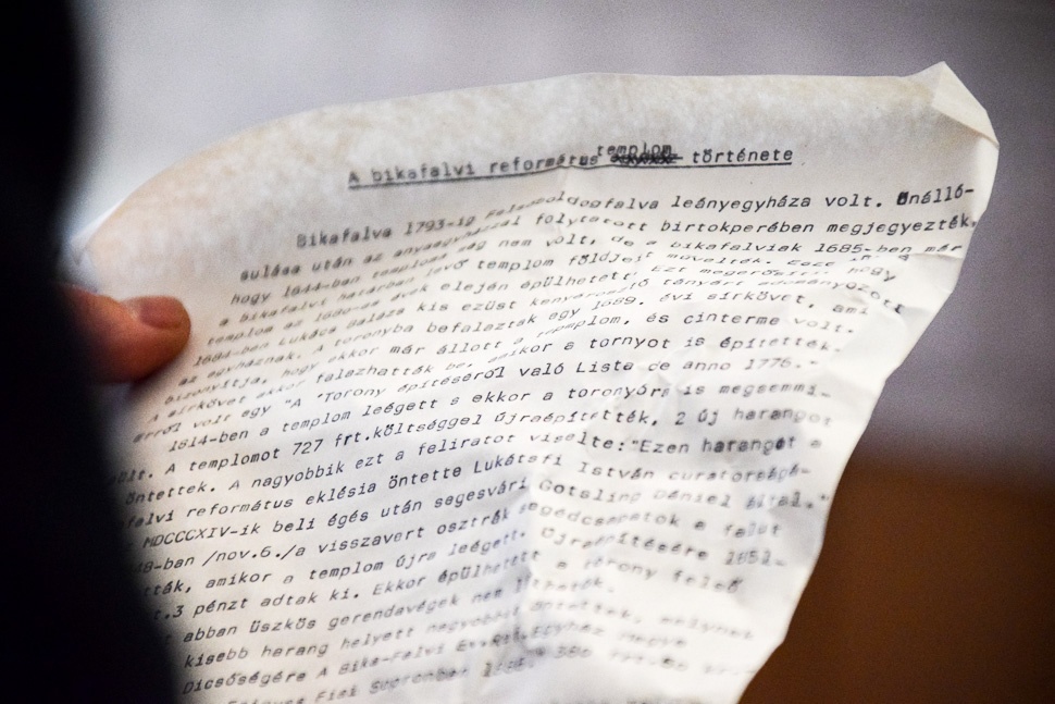 Rögtön kezébe is vette a kalapácsot a gondnok, az üveg nagy csörömpölés közepette szilánkokra tört, s a mindössze egy oldalas levél kiesett belőle: A bikafalvi református templom története – írta a levél tetején, amelyet hangosan fel is olvasott nekünk a lelkipásztor.