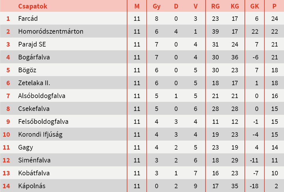 Az V. Liga Udvarhely körzeti csoportjában Bogárfalván szenvedett 3-2-es vereséget a listavezető Farcád, akárcsal a második helyezett Homoródszentmárton a parajdiak otthonában. Az élen tehát nem történt változás, de az első helyért már négy csapat lesz versenyben a bajnoki odavágók utolsó két fordulójában.
