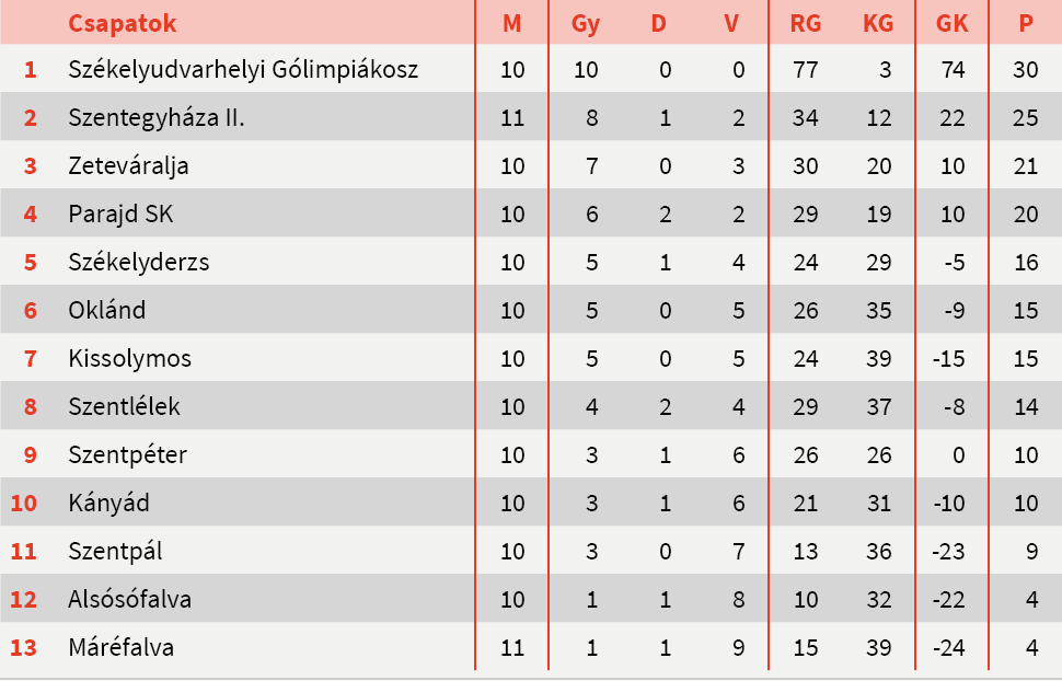 Szoros találkozón van túl a IV. Liga nyugati csoportjában a listavezető Székelykeresztúr. A szombati játéknapon 1-0-ra győzte le a Székelyudvarhelyi Roseal együttesét, megtartva ezzel vezető pozícióját. A második helyezett Sporting is hozta a kötelezőt, Betfalva ellen 4-1-es győzelemmel szerezte meg a pontokat, így tovàbbra is ott van a keresztúriak mögött. Kettejük közt mindössze a gólkülönbség dönt a keresztúriak javára. A harmadik helyre Nagygalambfalva jött fel a tizenegyedik fordulóban.