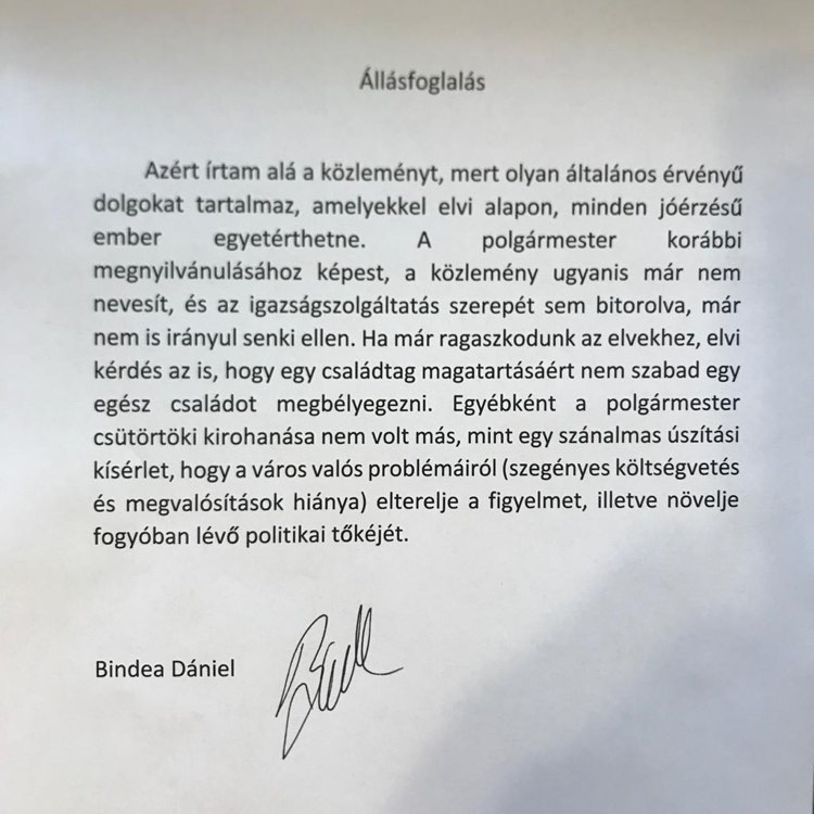 Hétfő délután Bindea egy Állásfoglalás című dokumentumot juttatott el hozzánk, ebben az van, hogy aláírta Gálfi Árpád erőszakot elítélő nyilatkozatát, mert az a polgármester korábbi, csütörtöki beszédéhez képest jóval általánosabb megnyilvánulás, nem nevesít, és nem uszít.