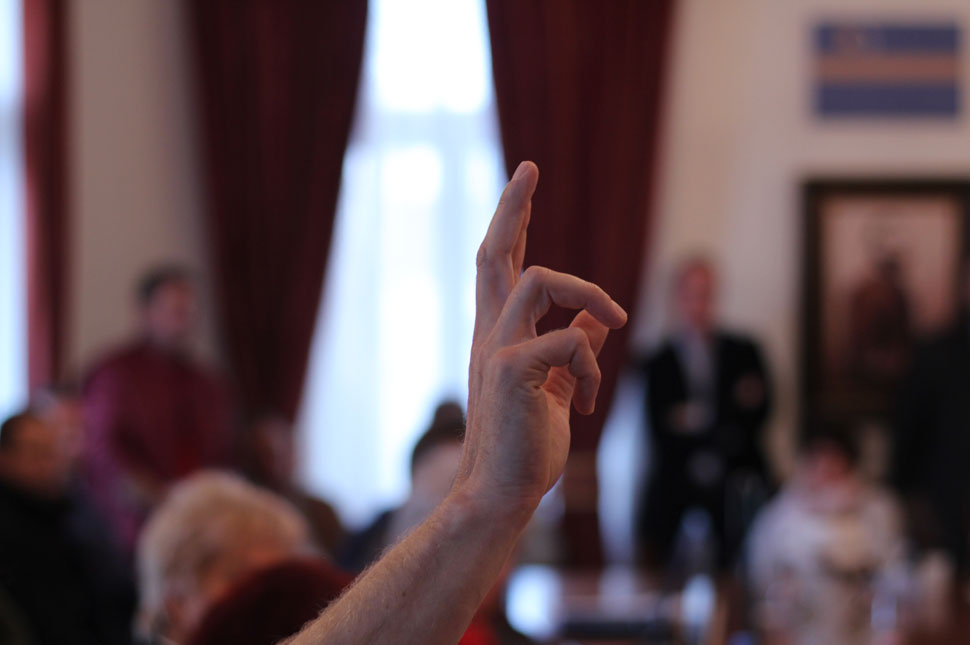 Lassan az állóhelyek is elfogynak a teremben Jelen vannak a kerékpársáv mentén boltot működtető vállalkozók, Körösfőy Sándor, az RDE igazgatója, ja és a tanácsosok.