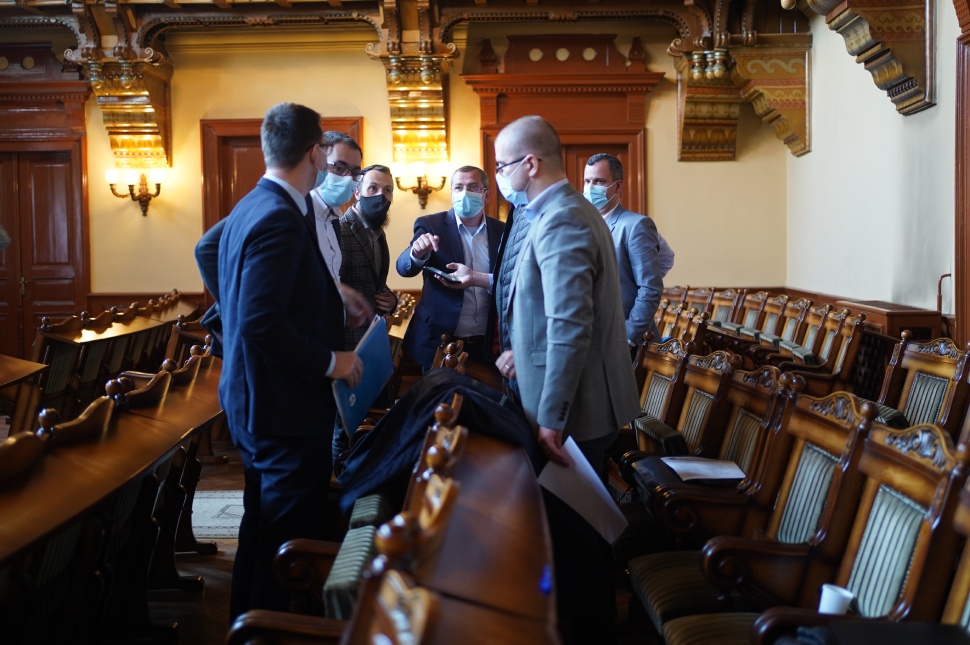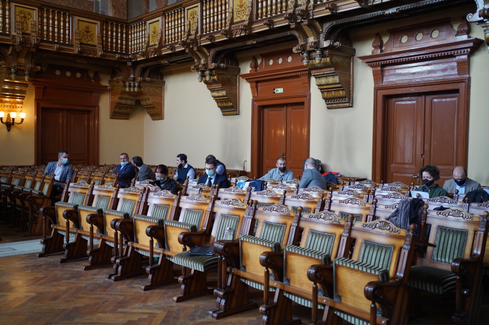 9 óra elmúlt, de még csak néhányan lézengenek a Szent István teremben, annál többen az előtérben. Berde Zoltán (RMDSZ) és Bindea Dániel (MPP) közben megközelítik a pódiumot, ahol minden valószínűség szerint iktatják a módosító indítványaikat a költségvetéssel kapcsolatban, ami ennek a tanácsülésnek a lényegi pontja lesz.