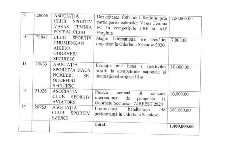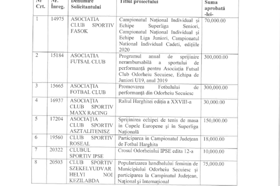11.04 Jöhet a sportpályázatok kiosztása. Változtak a részösszegek, a keretösszeg változatlanul 1,4 millió lej. Derzsi László szót kér, mielőtt szavaznak.