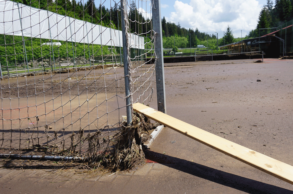 Munkatársai mutatják, hogy meddig ért előző este, és mit tett a víz: elvitte a híd korlátját, s ha nem húzzák többen is belülről, elvitte volna a bejárati ajtót is. Meghordta kővel a gyepet, mocsokkal a fűtött vizű strandmedencét, iszappal a focipályát. A füvesítést is másképp képzelte, mint a kertészek: a pálya szélén levő hálót tömte meg az útjában letépett növényekkel.