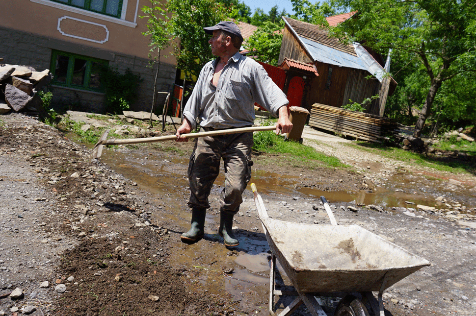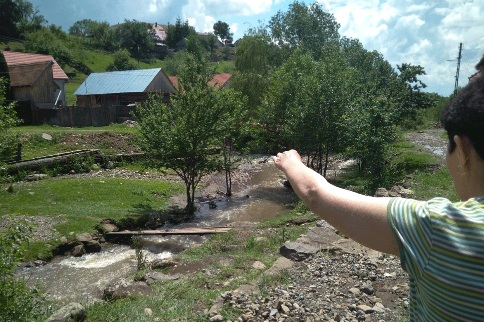 Lesétálunk a patak mellett, pontosabban kőről kőre, sárból pocsolyába ugrálunk a kimosott úton. Egy család a bennvaló elejét teszi rendbe. Farönkök és szalmabálák vannak a kapu előtt, a rönköket az esőben húzatta traktorral a fia oda, a bálákat a férje adogatta, ő meg szaladt velük, hogy valahogy megakadályozzák, az alsó lakás elázását. Hozzájuk is bement a víz az udvarra, szinte elvitte a kaput, mondja egy ismerős arcú asszony.