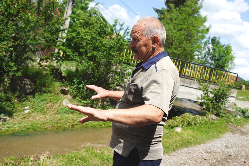 Körülnézünk a falu felső részén is, itt még nagyobb kárt okozott az áradás. A kultúrotthon mellett balra fordulva rövidesen véget ér a térkövezett útszakasz, és a patak mellett egy férfit látunk, amint egy lapáttal a kezében dolgozik az úton. Azt mondja, hömpölygött előttük is a víz rendesen, nem mert átmenni az úttesten. A pincelakásba nem hatolt be, mert a tíz évvel ezelőtti árkor vettek egy visszazárószelepet, ami kiengedi a vizet, de be nem. Az aradi ismerősöktől tanulták el a cselt.