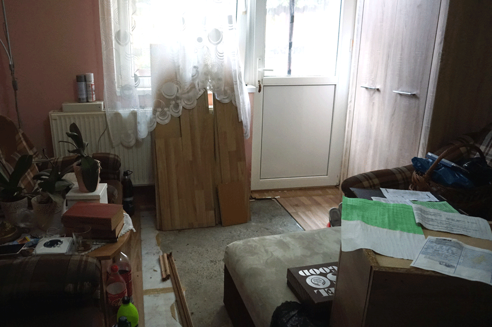 Számítógép, képernyő fogad a bejárati ajtóban a földön. Levetett papucs az egyik lakás előtt jelzi, hogy itthon vannak. Bekopogunk. Egy középkorú nő meg a lánya pakolásznak a pici, kétszobás otthonban. A bútorok a szoba közepén, a szalagparkett felállítva az ablak elé, az autó törzskönyve kiterítve a kivett fiókokra. A lány épp csavarja a vizes ruhát, amit a szekrényekből szedtek ki. A kisszobában is hasonló a helyzet – magyarázza az édesanya.