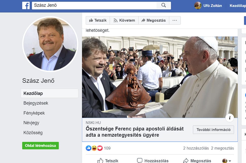 Az október 2-i pápai audiencián Szász Jenő, a Nemzetstratégiai Kutatóintézet udvarhelyi származású elnöke fogadta Őszentségét, Ferenc pápát, aki magyarul, Isten hozott!-tal köszöntötte a stratégiai elnökünket, majd áldását adta a nemzetegyesítés ügyére.