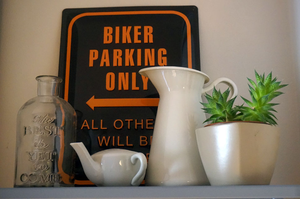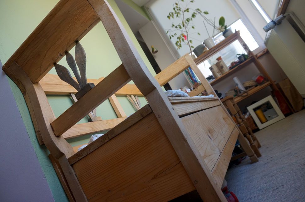 A lóca a teraszon nagyszüleimé volt, megmentettük, nagyon szeretem. Ezek olyan apró tárgyak, amit egy modern lakásba is be lehet csempészni a kontraszt kedvéért. A reggel nekem ott kezdődik a padon, a párom szokott is viccelődni, hogy kiülök, mint a vénasszonyok a padra. Onnan nézek szét, hogy elindult-e az élet.