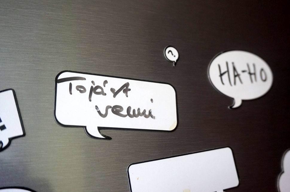 Minden héten nem állok ide újrarajzolgatni az ábrákat, de használjuk a felületet, egymásnak poénos üzeneteket hagytunk rajta, vagy mikor activity-t játszunk a baráti társasággal, akkor ezt használjuk papír helyett, vagy a bevásárlólistát felírod, lefényképezed, sok mindenre lehet használni. Van egy mágnesfesték alatta, hogy hűtőmágnesekkel fel lehessen tűzni üzeneteket, képeslapokat. Sokan félnek a fekete faltól, pedig gyerekszobába is nagyon praktikus lehet.