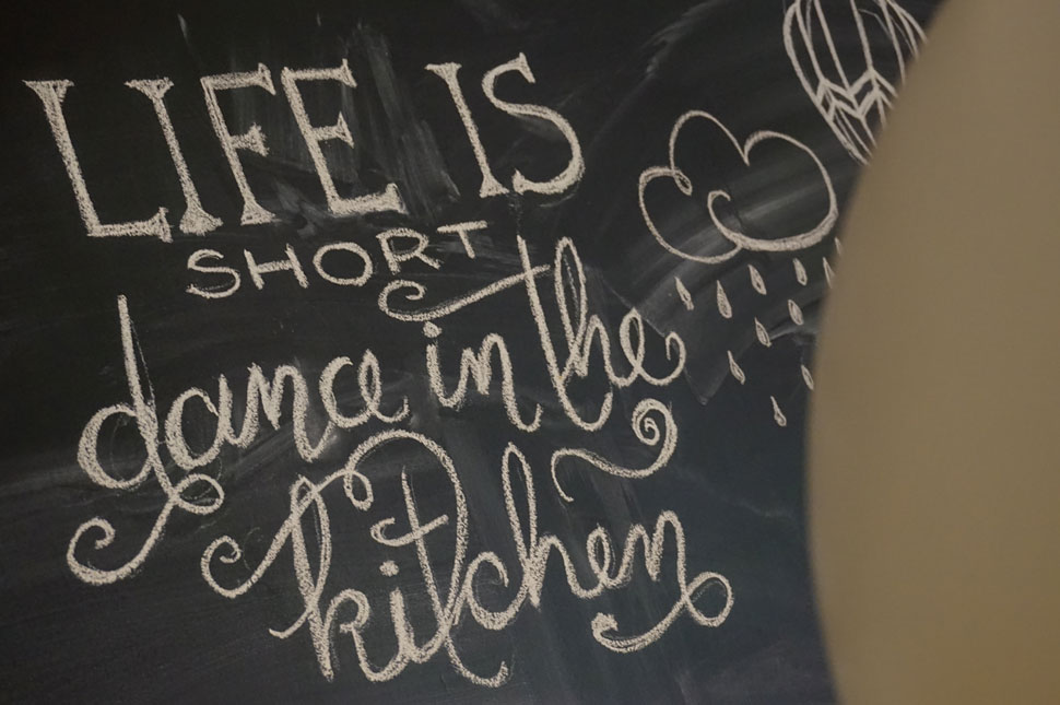 Igen, ez úgy is született, hogy láttam Pinteresten, milyen vagány. Gondoltam, nekem is kell. Utánanéztem ennek a táblafestéknek, van sötétzöld meg fekete színben, nem bonyolult dolog, egyszerűen legurítod a falat vele, kicsit többet kell száradjon, mint egy sima festék. Nem annyira szép, mint az internetes fotókon, mert a krétapor ilyen fehér nyomot hagy, nem tökéletes fekete. De engem az sem zavar, ha valami tökéletlen, mert épp attól lehet vagány.
