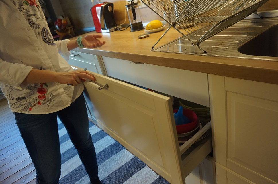 A funkció a legfontosabb, hogy praktikus legyen az elrendezés az itt zajló munkafolyamatot alapul véve. Tehát a hűtőszekrény- mosogató -tűzhely sorban, vagy háromszögben legyen elhelyezve, közte megfelelő méretű munkafelülettel. Most már rengeteg eszköz van forgalomban, amit be lehet vezetni, hogy egy konyha praktikus legyen. A konyhaszekrény alsó korpusza régebb mindig ajtós volt, ami ergonómiai szempontból nehezebben hozzáférhető, mint egy ugyanakkora méretű fiók. Például, ha a szemetesi ki tudod húzni, fölötte pucolhatod a zöldséget, vagy itt van a szintén kihúzható fűszertartó polc.