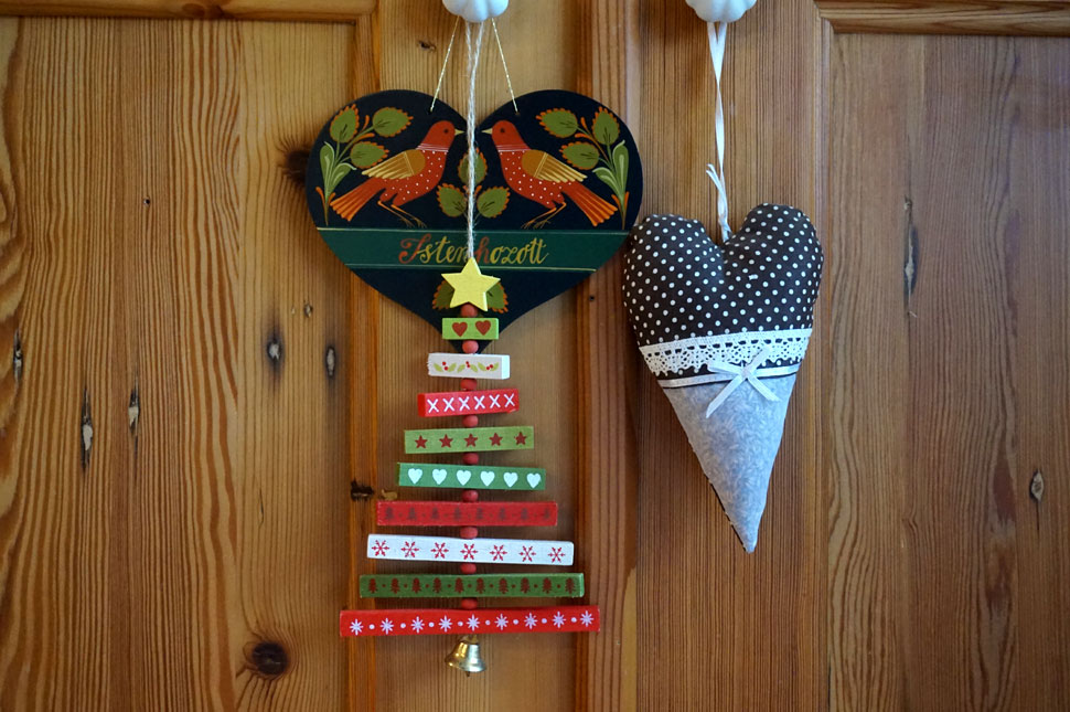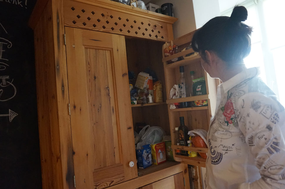 Ez a szekrény is egy régi bútordarab, még apuék készítették exportra, úgy, hogy a franciák ideküldték a régi faanyagot, itt bútor lett belőle és visszakerült Franciaországba. Látszik is, hogy ez kerítés volt egykor, a szeghelyek sötétebbek, nem itteni fenyő, sűrűbb az erezete, vöröses a színe. Ez tulajdonképpen megmaradt prototípusnak, a műhelyben állt tíz évet, beleszerettem, lecsiszoltuk, ki van kicsit javítgatva, le van kezelve és ugyanúgy viasszal le van kenve, kamrának használjuk most.