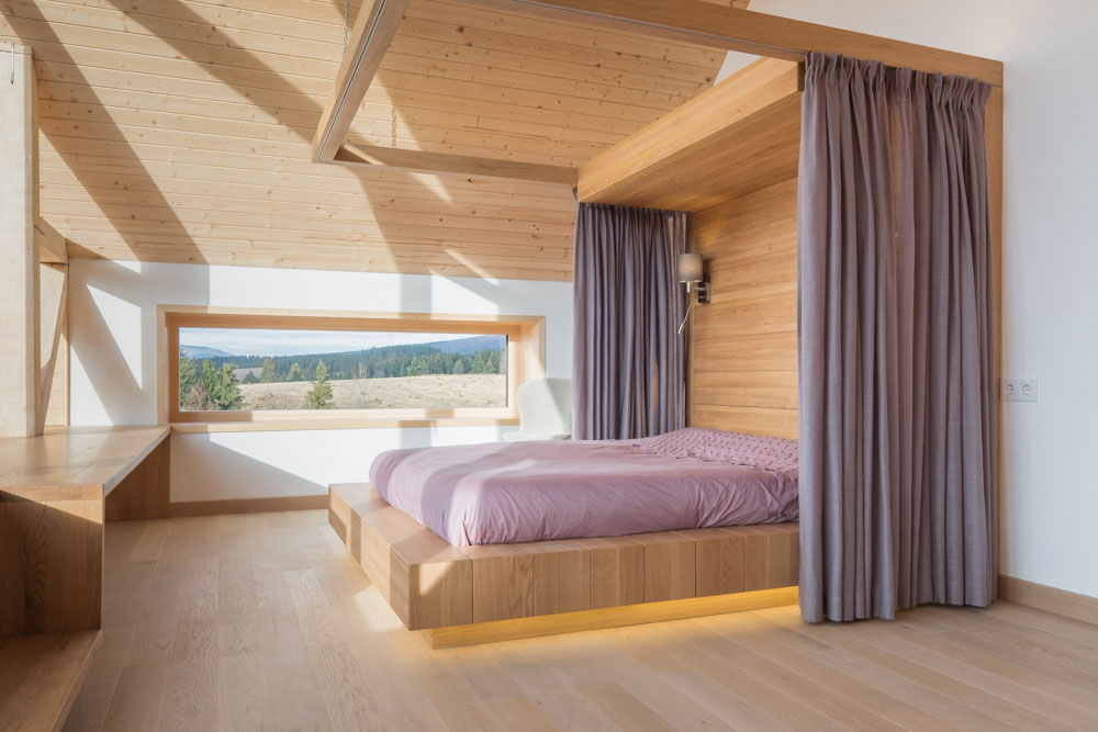 Az óriási ablakok miatt közelinek érzed a természetet. A hálószobában az az izgalmas, hogy emeleten vagy, de ki tudsz sétálni a zöld tetőre. Itt is nagy ablakok vannak, ezért született meg ez a körbefüggönyözhető ágy.