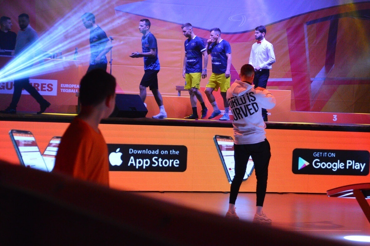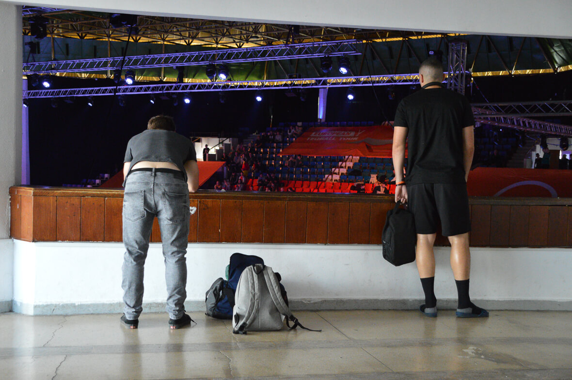Amikor belépek a csarnokba, feltűnik, hogy minden teqballosítva van: hajlított asztalok állnak a bejárat előtt, teqballos mindenféléket árulnak az előtérben, világbajnokságokról készült fotók díszítik a falat, és labdarúgó sztárok mérkőzéseit vetítik az ide-oda kihelyezett képernyőkön. Már a játéktérben azon kezdek el izgulni, vajon hogyan sikerül majd fotózni ebben a színes reflektorfényekkel megtöltött, viszonylag sötét teremben. Györgydeák Aporral később beszélgetve kiderül, neki bejött a szervezés, a fények picit zavarták az elején, de hangulatosnak tartja, azt is mondták nekik, hogy a shownak mennie kell.