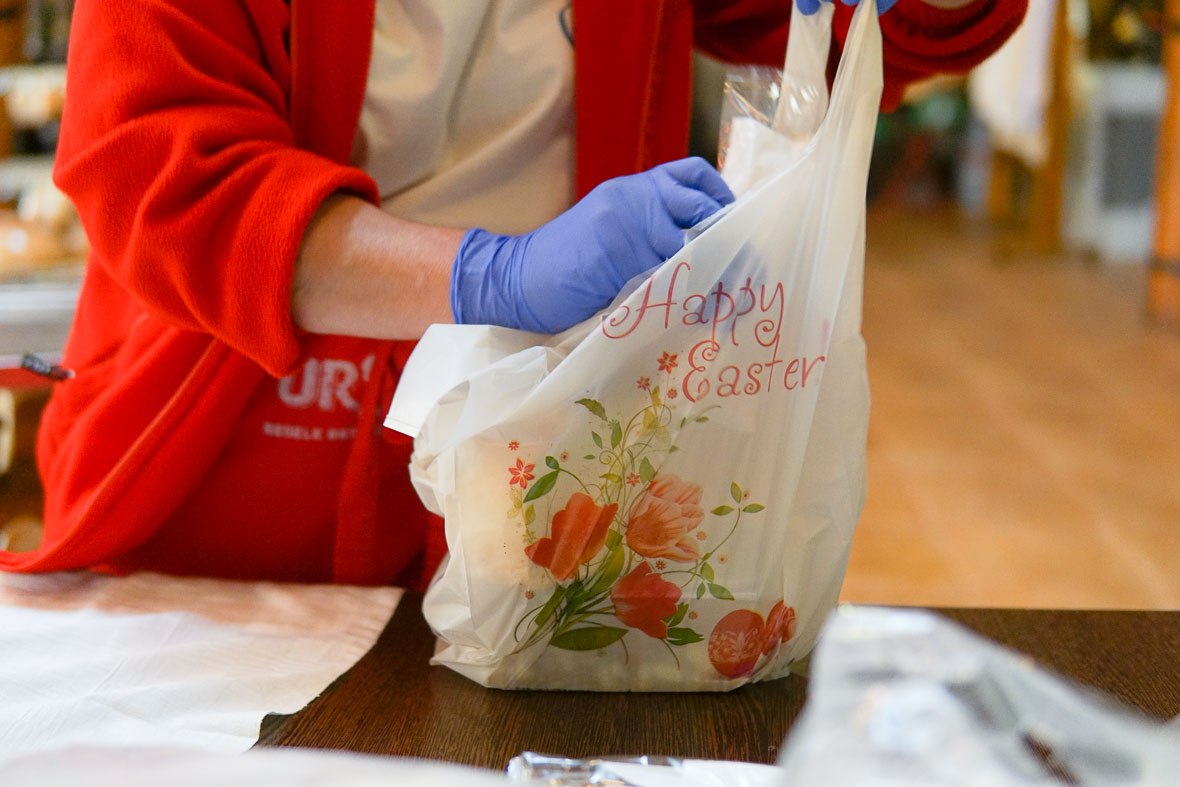 Fidelis nővér elhelyezi a boldog húsvéti zacskókat a még boldogabb karácsonyi neccbe. Remélhetőleg karácsonykor nem lesz szükség újabb koronavírusos ebédosztásra.