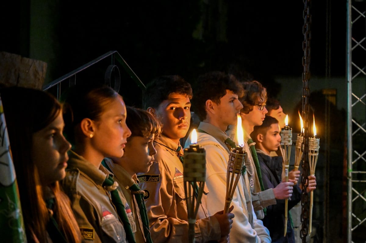 Vigyázz! – érkezett a parancs. A cserkészeknek, de az egész tömeg követte, s fél szemével a fáklyát, másikkal a színpadot lesve énekelte közösen a Vox Gimiensis kórussal a magyar himnuszt.