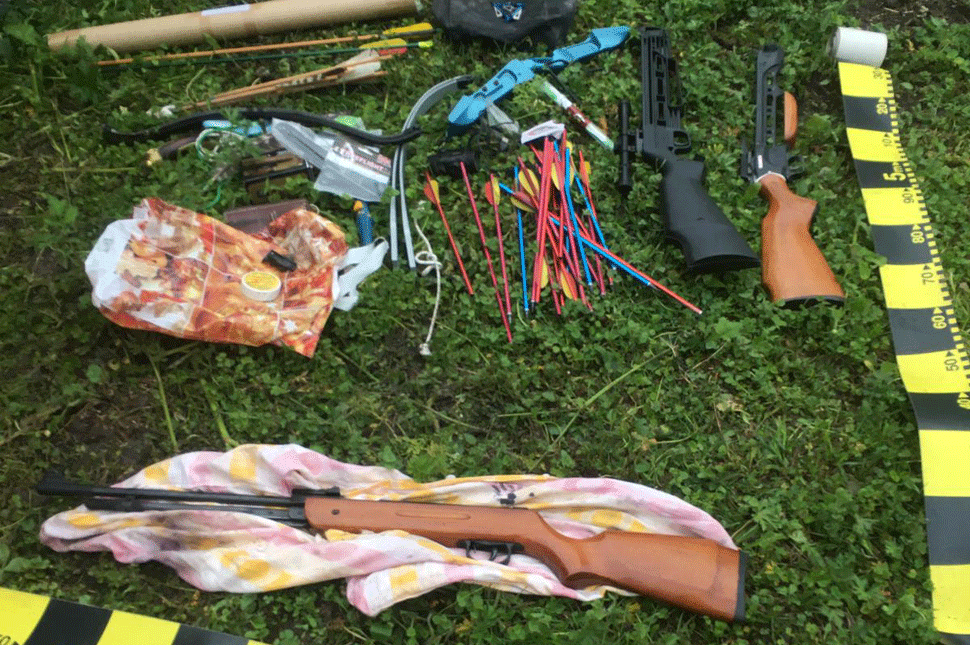 A jogtalanul tartott fegyverek mellett íjakat, töltényeket és pirotechnikai eszközöket is találtak.