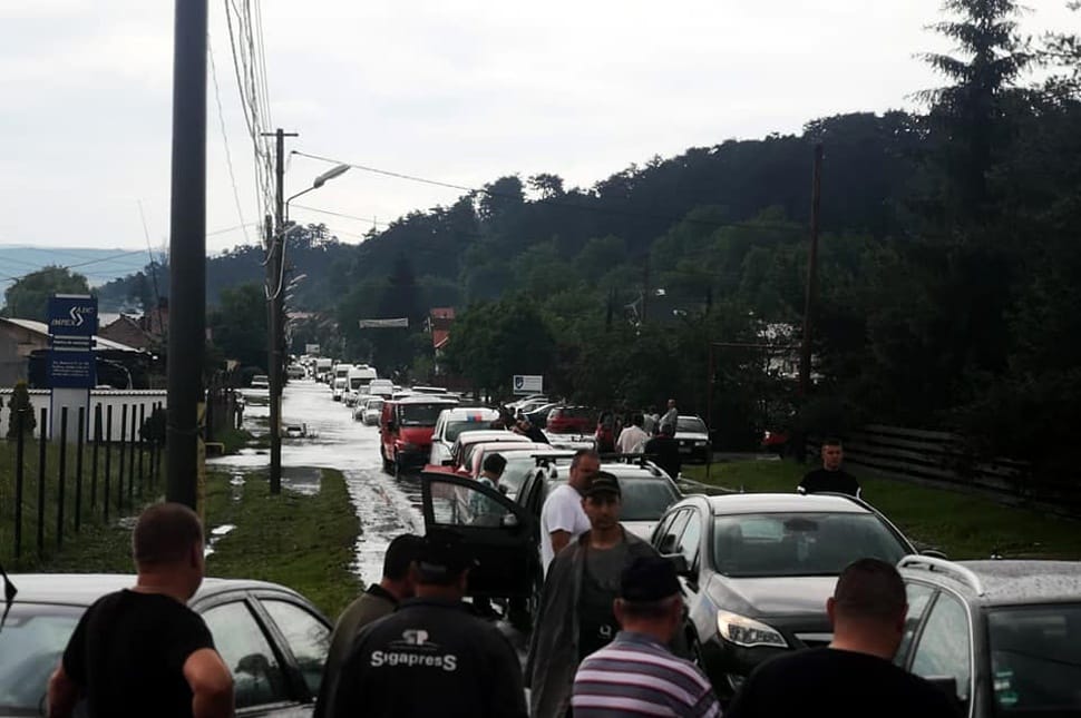Nagy víz hömpölyög az úton, nagy a kocsisor.