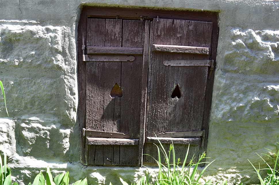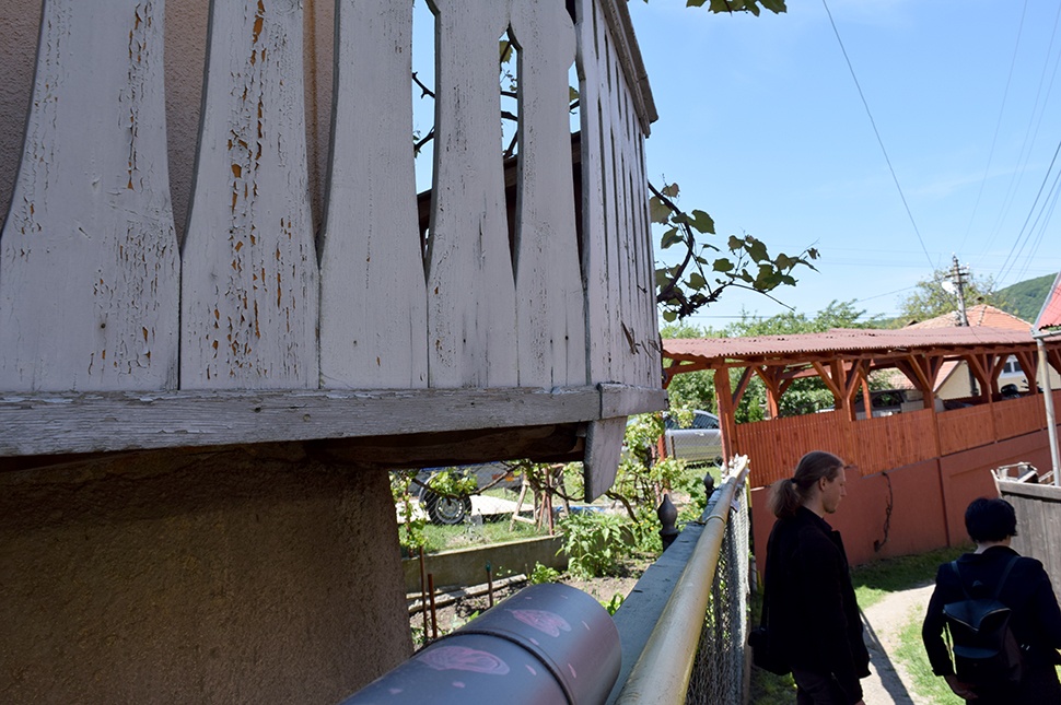 − Ezek a szívecskés kis ablaktáblák – fejjel lefelé helyezték el szegényeket – is nagyon aranyosak. Ez az emberi butaságnak a bájossá átlényegült kategóriája. Ha kinyitod az ablaktáblát, kiesik. Néhány ház az egész utca, − de rengeteg szépséget tartogat: − Ezzel a technikával jellemzően a csűrök oldalát burkolták, − mutat egy épület deszkával burkolt oldalára − volt is olyan tervünk, ahol felhasználtuk az innen kölcsönzött textúrát, annyira megtetszett nekünk.