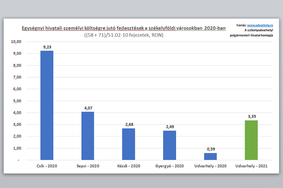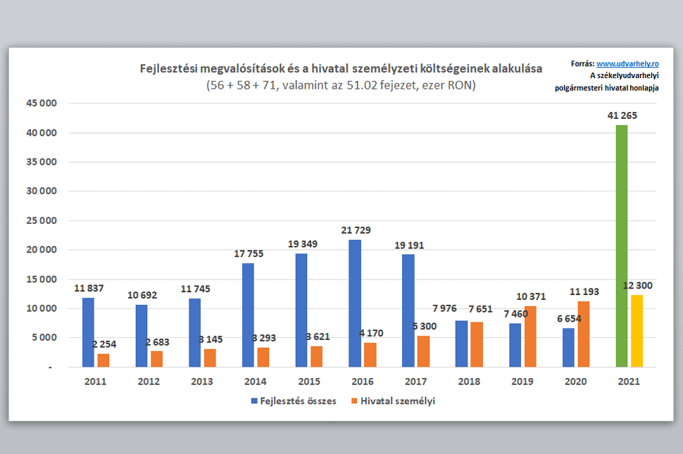 Tíz év alatt majdnem megötszöröződtek a hivatal személyzeti költségei, ehhez képest a fejlesztési megvalósítások költségei nem hogy nem nőttek, de míg 2016-ban 21.729.000 lejt költött a város fejlesztésekre, addig ez a szám 2020-ban nem érte el a 7.000.000 lejt sem.