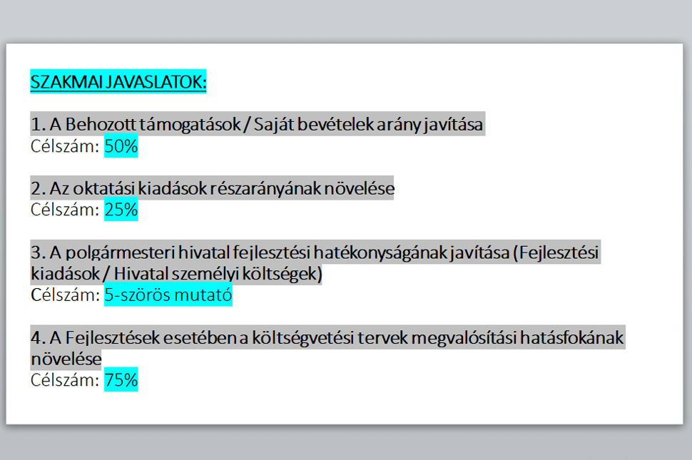 Szilágyi ezzel kapcsolatban meg is jegyezte, hogy őt kifejezetten zavarja a fizetések és fejlesztések aránya, amit Geréb javasolt. Nem minden hivatalnok foglalkozik beruházásokkal, de attól még fontos munkát végeznek, például a szociális osztálynak is megvan a maga létjogosultsága. Helyesebb mutató lett volna szerinte, ha megnézzük például, hogy a fejlesztési osztályon hányan dolgoznak más városokhoz képest.